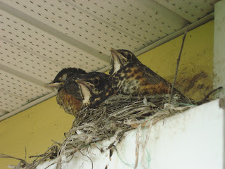 Yes, we came back to baby robins again in their usual place outside our bedroom balcony door. The nest is on top of the screen door which is bifolded up for the Winter. I just caught them before the fledged, it’s a wonder there was any breathing room left with these overgrown chicks. Next year I really have to find a child to give the nest to for ‘show and tell’!