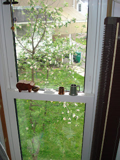 While slaving away in my studio, catching up on sweater orders, making buttons, trying to keep the studio tidy, pay bills, keep paperwork straight and… and …. and… I spied apple blossoms outside my rear studio window. The tree has been there for as long as I have been in this house and in this studio (14 years) but I don’t remember it blossoming like this. Yes that’s my original machine there… the HK 100 that I got in 1983. Rather like the peony we have in a back corner of the garden behind the house where we rarely go (well we walk past it on the way to the composter), it now blooms beautifully though nothing for the first few years we were here.