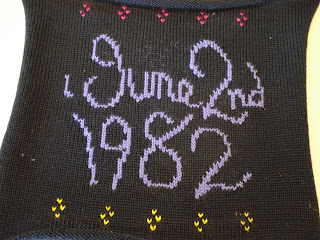 This charming bit of knitting was what I knit for Janet Morton’s knitted squares exhibition at the Textile Museum in Toronto a few years ago. Anyone was welcome to submit a knitted square from 3″ x 3″ up to 18″ x 18″ (I chose the larger) with a date knit in. The date had to be significant and the piece had to be accompanied by a letter explaining the significance. It was an amazing exhibition. I went with my Mum.