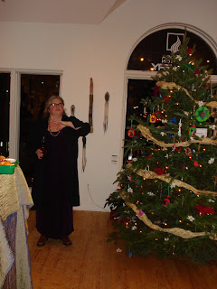 Later that same evening, just before Christmas, my dear friend Sandy Whitton held her ‘artist’s party’ for the artists exhibiting in her Art of Giving show in her gallery. It’s always great to get together with other artists and artisans where you don’t have to pretend you’re there for the art or have to keep a look out for customers in your booth. Here she is talking about the tree and the ornament (or ‘artament’ as Rachel her trusty assistant named them) swap. I didn’t make one so I wasn’t involved. Some of the ornaments were wonderful, beaded book marks, felted balls, paper, wrought iron, polymer clay… and then some little ones that were like a short golden cigar with a couple of red bells…hmmmm. Realizing they were actually tampons covered in foil ( they com already strung) I went in search of the designer. J T Winik is an amazingly talented painter with, I found, an odd sense of humour! Still waters run deep.