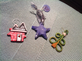 ornaments. I had made three to be sent out and these are what I got in return….this is so much fun. Just as an aside, the knitted piece they are lying on is on my ironing board, it is the back of a new cotton design for the Spring.