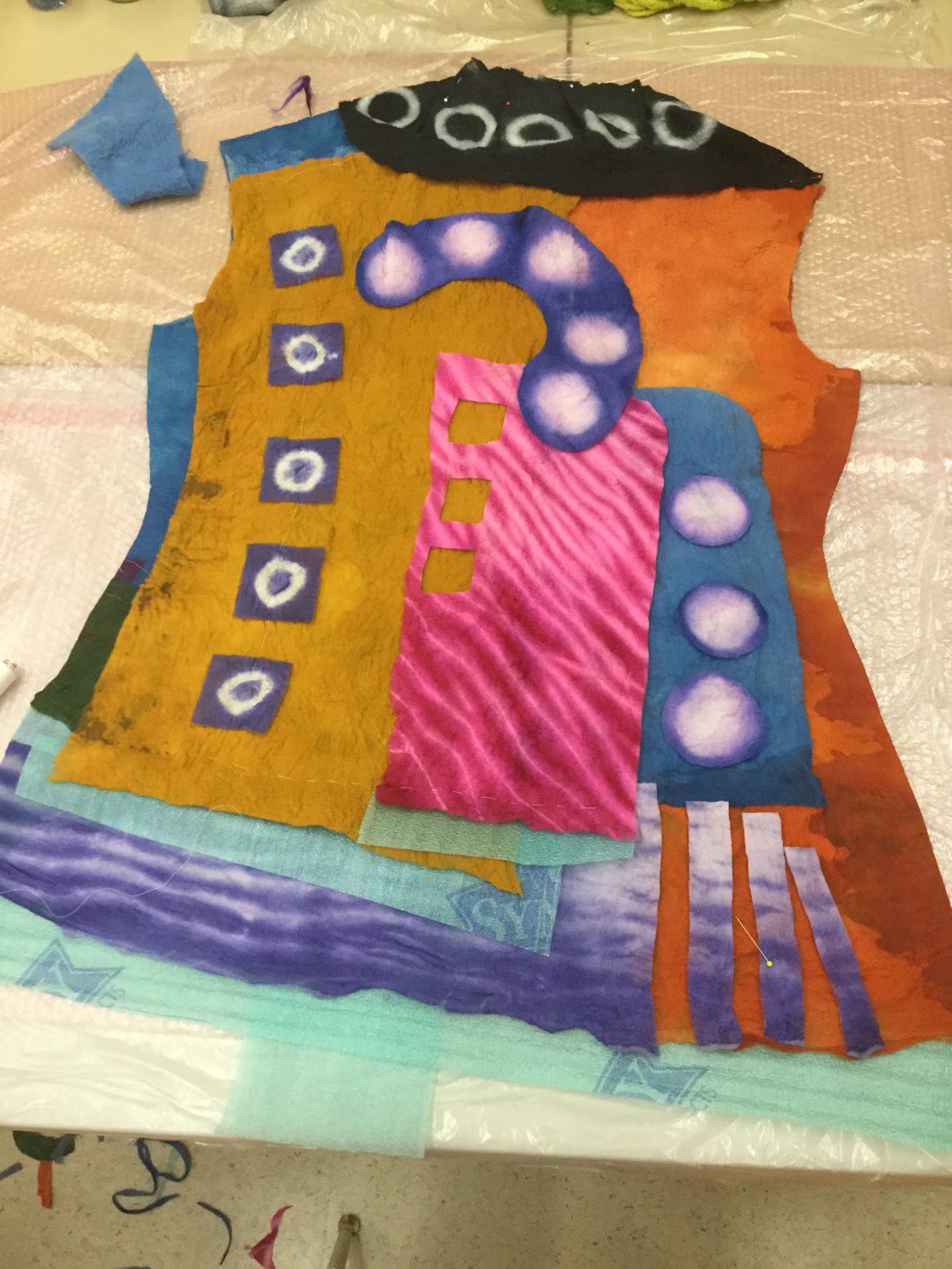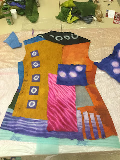 After spending Tuesday with one wall of the room full of tables with burners for the dye pots this is what I ended up with. I cut up my 6m of prefelt into random bits…I didn’t really know what I was going to do with them but I knew I needed enough colours and pieces to create the mosaic garment.