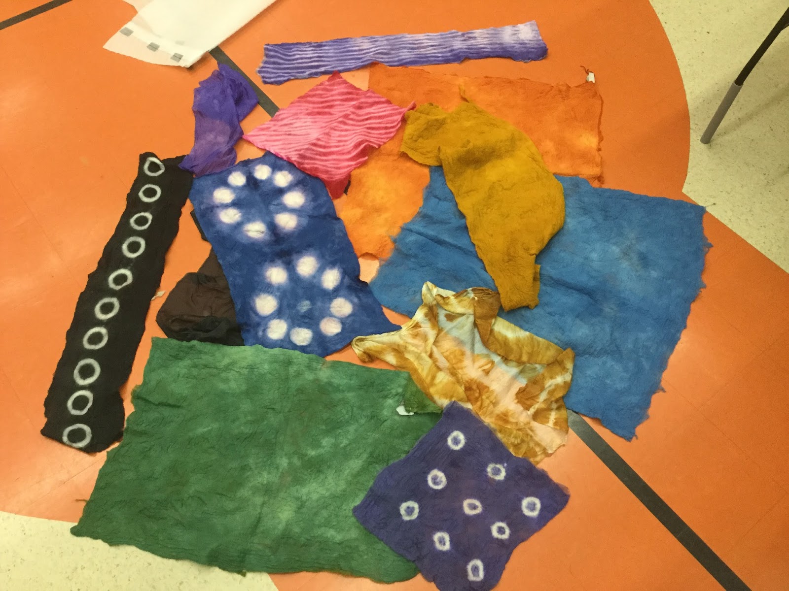 Some of these were dyed solidly and others the shapes and resists were marbles, discs, rubber bands, string, a wine bottle, pvc piping…..