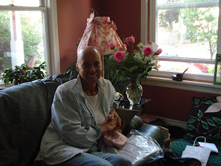 Well, Sunday at the Run for the Cure was a great day, I ended up eating chicken breast for supper and started to feel good as I usually do heading into every third Monday – day four after chemo…..then Monday arrived and everything fell apart again. I felt I had had chemicals poured into me, everything smelt, tasted of chemo drugs my other half called the nurse, I said he was over concerned but she was really needed. I got sick again along with a short black out…scary. She stayed with me for two hours until hubby had picked up some needles for her to give me the IM version of the anti nausea drug…..and so on…. and so on. Anyway, this is me the next day feeling marginally better posing with a bouquet of roses and baby’s breath sent by an old friend in Britain. She had remembered I was married with pink roses and baby’s breath!!!