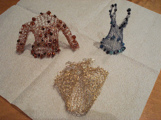 Grabbing a bite to eat before last week’s guest gig my friend Sonja pulled some great things out of her purse …. more wire knits. Here are the little jacket, blue evening dress and gold shrug with pearl beads. I photographed them on a paper napkin so they’re not great but I tweaked them so they’d stand up.