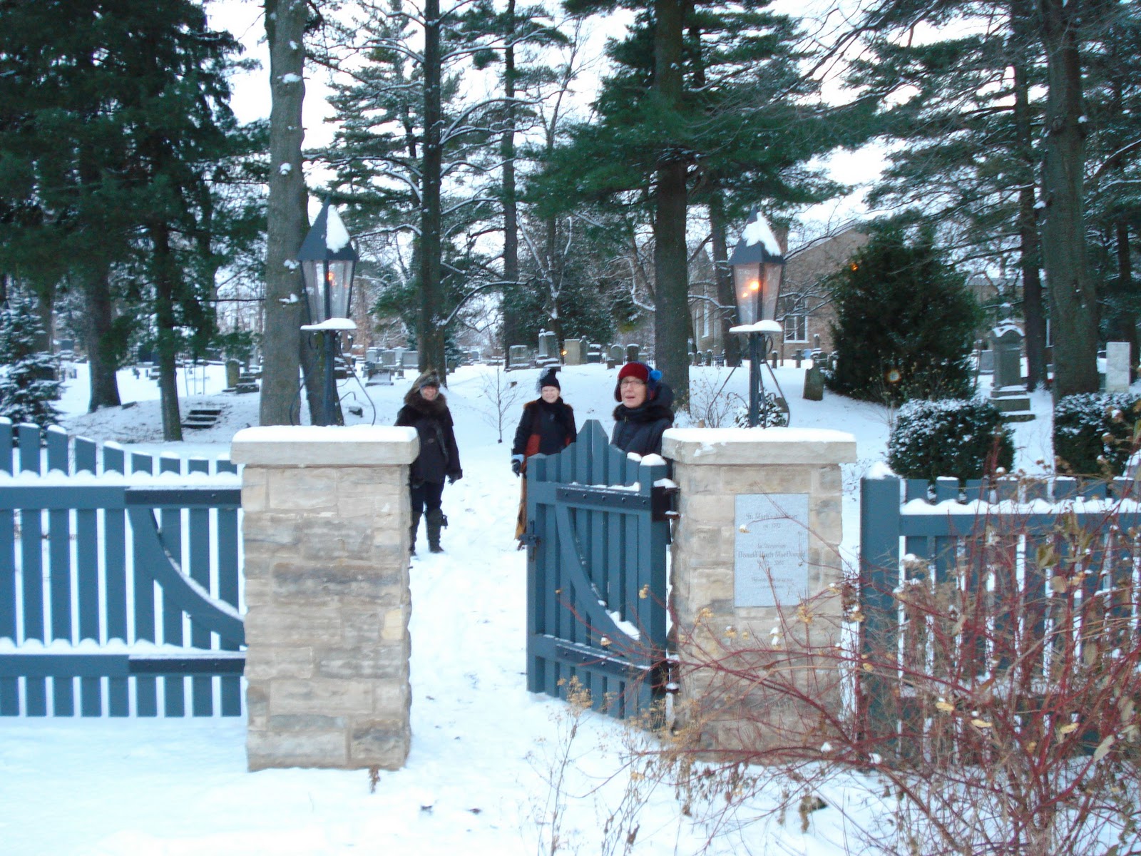 Here’s the gang taking a break to walk through the cemetery of the church near T’s house, beautiful after the snow dump earlier that day.