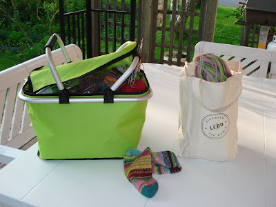 While away on vacation, I was doing hand knitting, stocking up on socks and knitting some hand knit flowers for a new Wrap I now do. Sometime before heading out I was in the LCBO and picked up one of their hand picnic baskets which fold flat and have a zip pocket inside and a zip lid. Sooo cute I bought a pink one too…. they come in four colours. Well, my balls of sock yarn have overflowed the large Ziploc back I put it in and so I threw them in this lovely lime green basket….. well it’s now my sock basket…. and I can always locate it. It sits beautifully on the floor next to the sofa so I can pick up and knit when I’m watching TV.