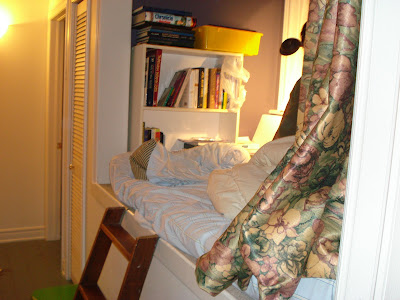 Camp out where you can for craft shows. Fanfayr was this past weekend in Kingston and I had two lovely friends stay over at our house for the show. We have a spare room and my friend Jannis of Olio Studio was tickled that we finally had a real bed in it (thanks Ikea) rather than the futon bed on the floor we’ve had for years. Another friend Margi Laurin of Altered Books stayed with us too! In the past I’ve put her in the studio on a roll away bed (thanks again Ikea) but I just couldn’t face moving all my mess around so I put her in the ‘nook’. Our house came with a wide shelf with windows and high enough to stand up in, in our upstairs hallway. It’s over the ceiling of our dining room wich is quite high. It’s carpeted and I used to sometimes sit and read there, it’s been storage and where I put my geraniums in the Winter as it faces West. I hung curtains in the three windows and a curtain along he outside so you are completely private and can stand up to dress!! I rolled out the roll away matress and some sleeping bags and stowed Margi on the ‘shelf’ among the books! She survived and thought it was like a couchette on a train! I recently put the 1o year old daughter of friends there and she was pleased as punch to have her own ‘room’.