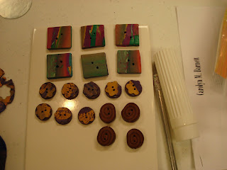 On the Friday afternoon the room got so hot we were peeling off our knits! Hence me in my camisole. This was the first group to tackle the button making, they did very well and some got some delightful surprises when they mixed the clay colours they had chosen. For a fee each participant gets two tools, a knife, a roller, a tile to work on and a selection of clay. As we didn’t have the number I had prepared for there was a bit more clay for them to take home.