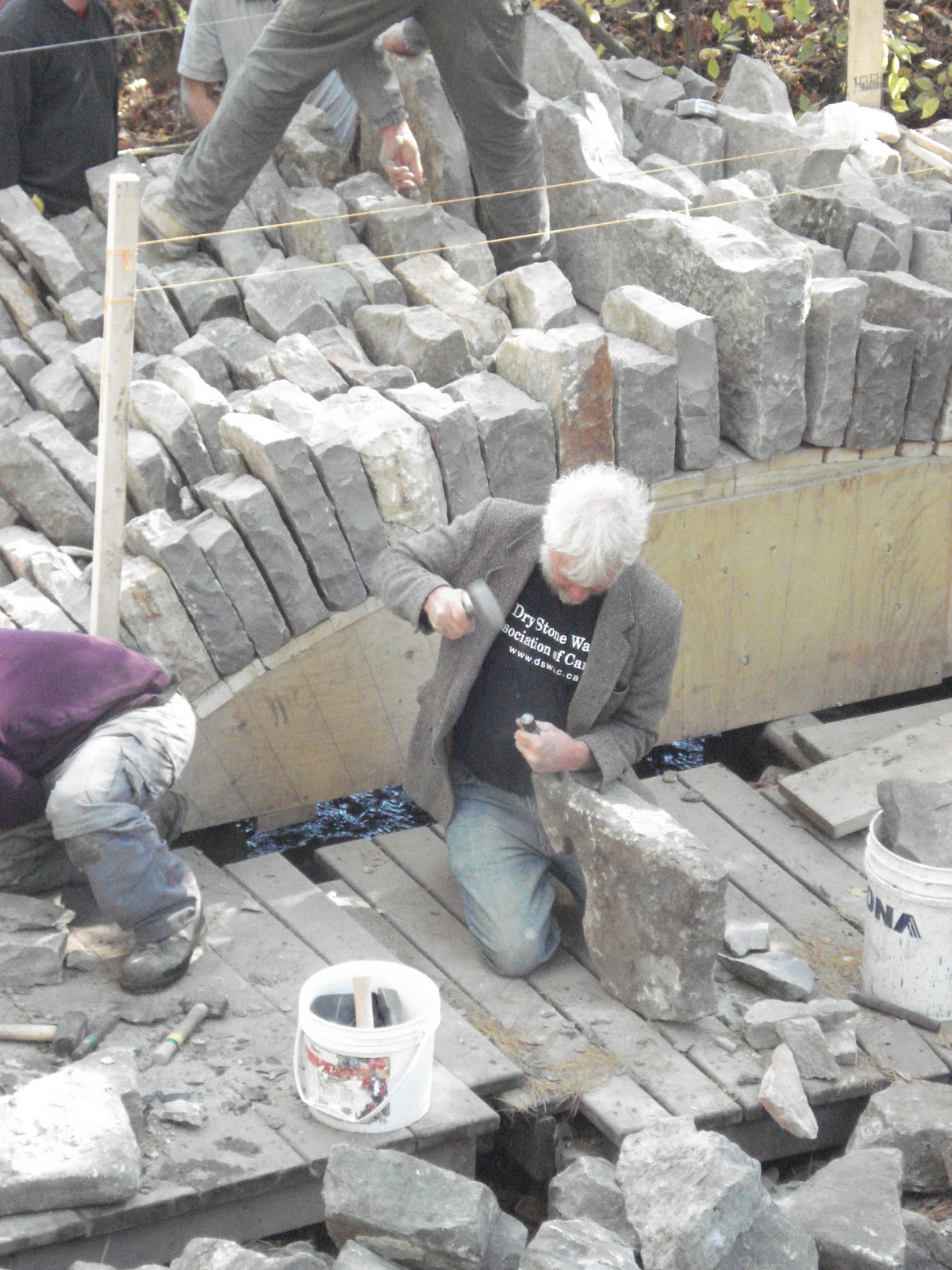 Here is a group of wallers working on building a bridge over a stream in the woods at Landon Bay Center. I didn’t know they used a wooden shape to mold the stones around, no mortar is used the construction and weight hold the carefully chosen and chipped away rocks together in the formation required (building, wall, bridge, fireplace, chimney, bridge abutment…….).