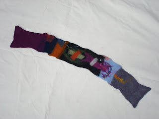Anyway, here are pictures of my first felting efforts for collars, this one I’ve put on a grey knit jacket and I’ve made buttons that go with it. I still want to make some embellishments for the cuffs, but I’m knitting the body for the other collar …. a black base. Here I’ve done the fancy stuff on the ends as that is the part of the collar that will show close to the face.