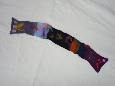 Anyway, here are pictures of my first felting efforts for collars, this one I’ve put on a grey knit jacket and I’ve made buttons that go with it. I still want to make some embellishments for the cuffs, but I’m knitting the body for the other collar …. a black base.  Here I’ve done the fancy stuff on the ends as that is the part of the collar that will show close to the face.