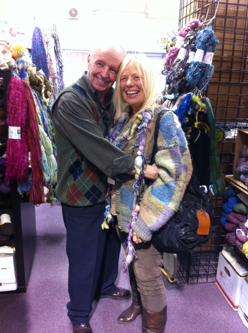 Well we thought we had died and gone to heaven!!! This is a large store with all sorts of hand dyed and hand spun and hand made yarns!!! Books, dyes, buttons…and so much more. We walked in and a gentleman approached from a back room…that is Larry Hart, co owner with his wife. Here’s a pic of Larry and Sonja after he had shown her the boa she is wearing, made of wool tops, yarn and ribbons.