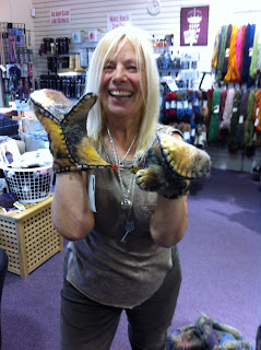 Sonja found some yummy felted mits. By this time we had our jackets off, had brought in a couple of things from the car, like Sonja’s copper dress, which we were taking to Spring Fling to display, and I was grazing through the excellent book shelf. We could have gone seriously broke here and it would be a regular haunt if we lived there! I purchased some dyes and hand spun yarn….I have a scarf in mind and some felting……..