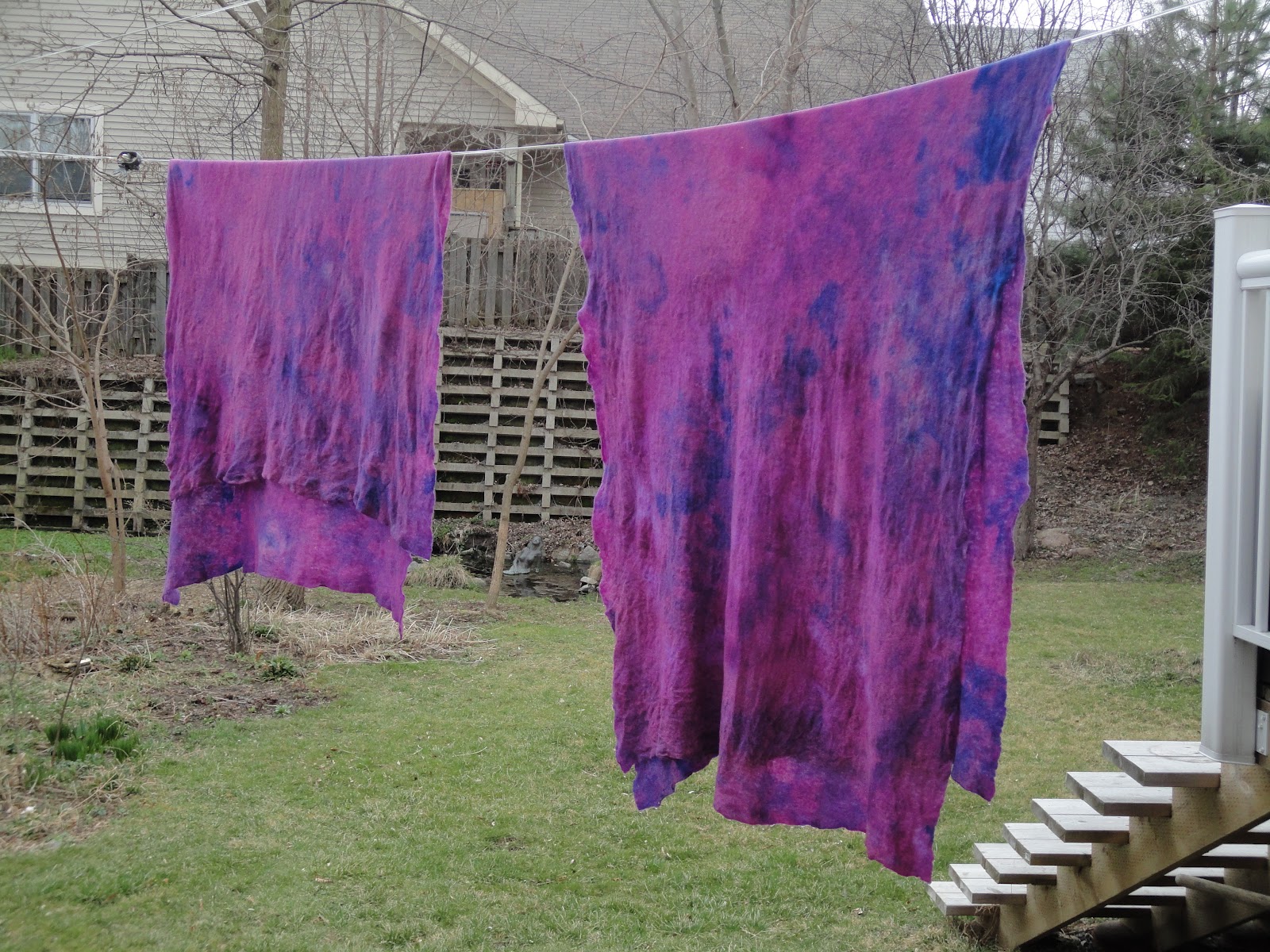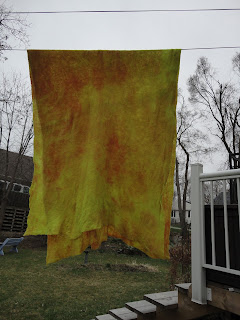 The great thing about the Spring and the warmer weather and no snow is that I can hang my dyed pieces outside on the line to drip and dry…. no dripping into our late cat’s litter box in the basement!