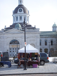 Out for breakfast after a week of ‘cleansing’ (you know… no chocolate, booze, coffee, preservatives etc and for two days, no solids) we went to our fave place in downtown Kingston: Morrison’s. We got a window seat across from the back of City Hall where the new outdoor skating rink is and there is always the apple guy who has cider as well as hot cider for the skaters. I noticed that next to him was Muse Handknitting. The youg woman is in the market (the oldest outdoor market in Canada at 204 years old) most market days and sells quite an assortment of handknits: socks, baby items, fashionable tops, bags… you name it, all knit in a heavyish wool. They are all wonderful