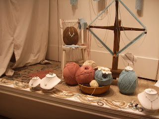 The silver jewelry shop next to my bank put in a ‘Winter’ theme using knitted scarves (purchased and one in progress) all in pink, blue and ecru, and some big balls of wool.
