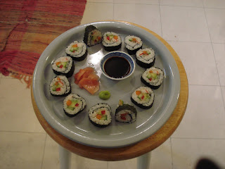 I will once again be having a preview evening tonight in my studio and it’s the wine and cheese type (the rest of the weekend is hot apple cider and cookies) so when my friend Harvey offered to show me how to make sushi I was hot to learn something new.