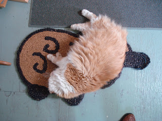 Well, I was going to write about something I’m sure a few days ago but cannot remember what, I’ve been so busy getting ready for the studio tour this weekend. Well, I do know that I couldn’t resist picking up my camera and taking a pic of our cat sleeping on the ‘sheep’ mat I have in my studio. Now that the weather is better I keep my studio door open and he wanders up the stairs and finds a place to crash for a while. I know… aaaaw!