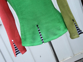 This is a cotton design called ‘Pip’ with little godets at the hem and cuffs of black and white stripe. Buttons to match, of course.