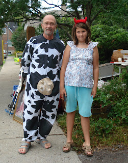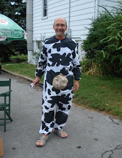 We dearly hoped that the rain that was forecast would hold off…. well, it didn’t happen and though it was overcast it was a lovely mild day. We were unaware that Linda up the road had costumy things but as you can see here, Jim from across from Linda made this stunning investment. Well, I hope he got a deal as there seems to me no head! Now Jim can say he left his wallet in his ‘udder’ suit!